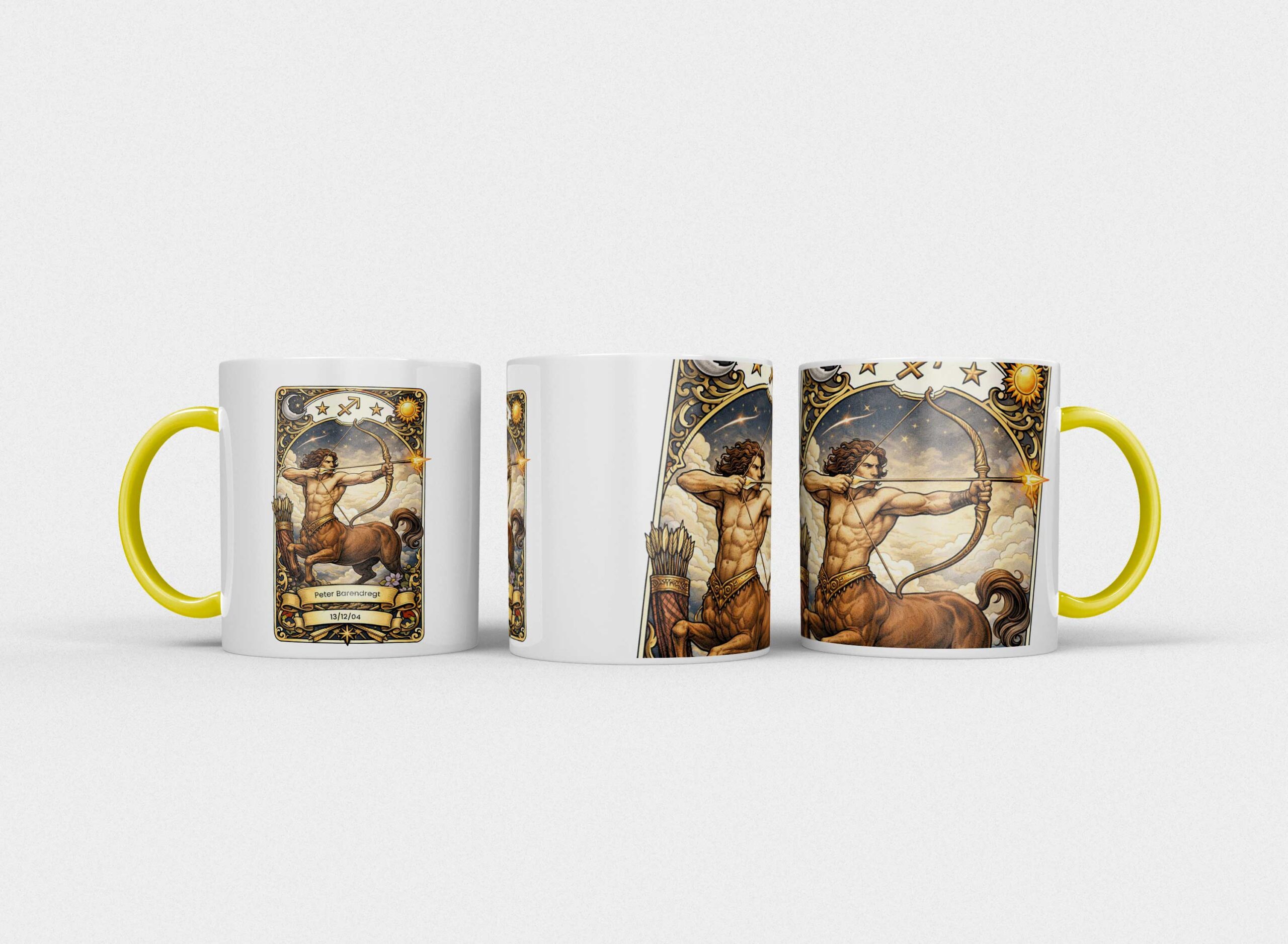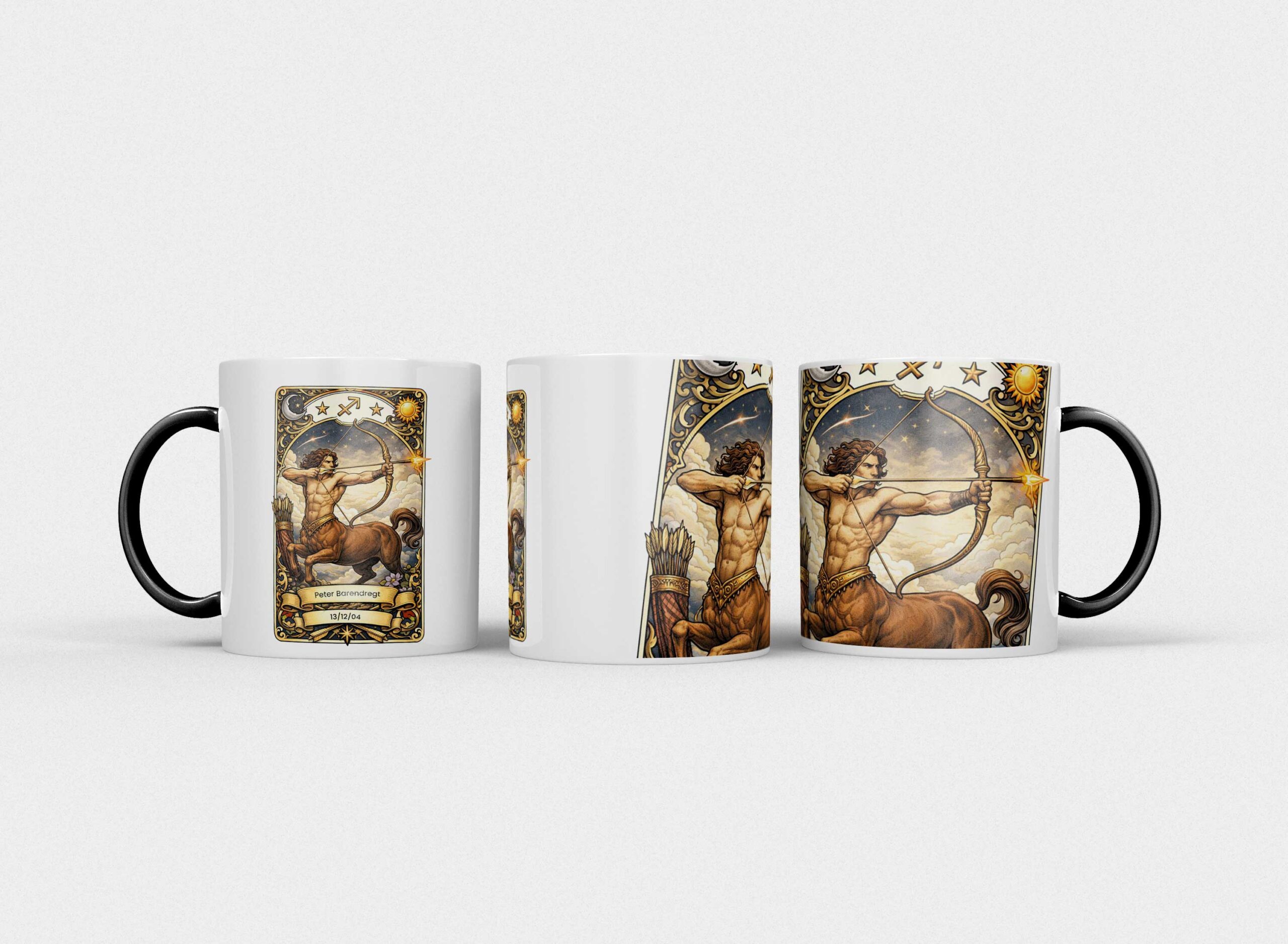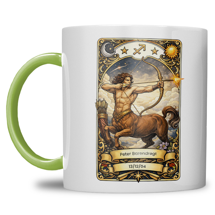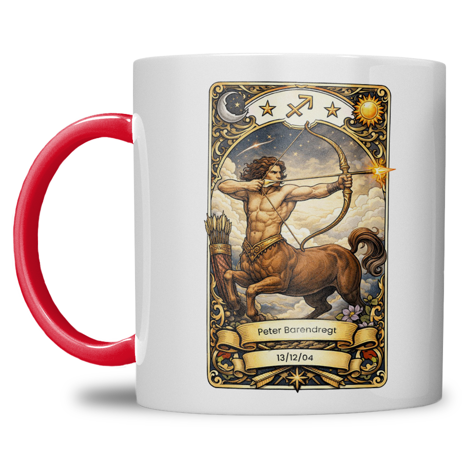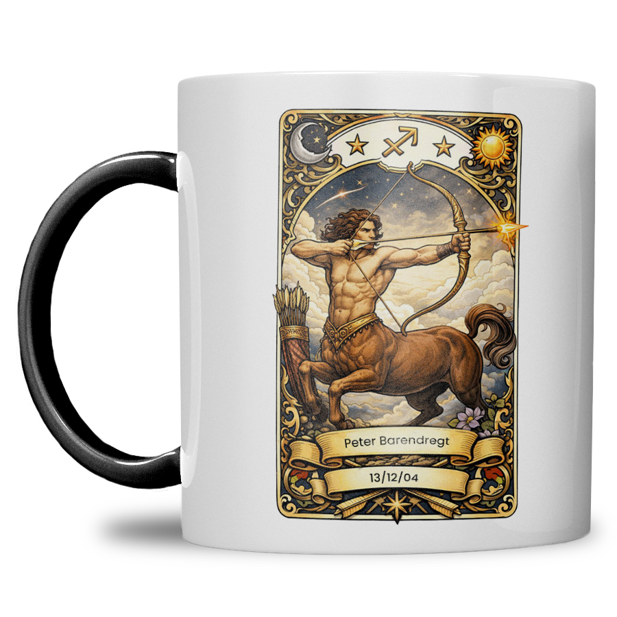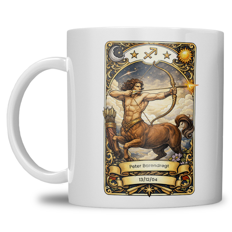 Ben je op zoek naar een avontuurlijk, inspirerend en persoonlijk cadeau? Deze gepersonaliseerde sterrenbeeld Boogschutter mok is speciaal ontworpen voor iedereen geboren onder het vrije sterrenbeeld Boogschutter. De mok wordt bedrukt met een krachtige Boogschutter illustratie in mystieke tarotstijl en gepersonaliseerd met naam en geboortedatum — een uniek en betekenisvol geschenk.