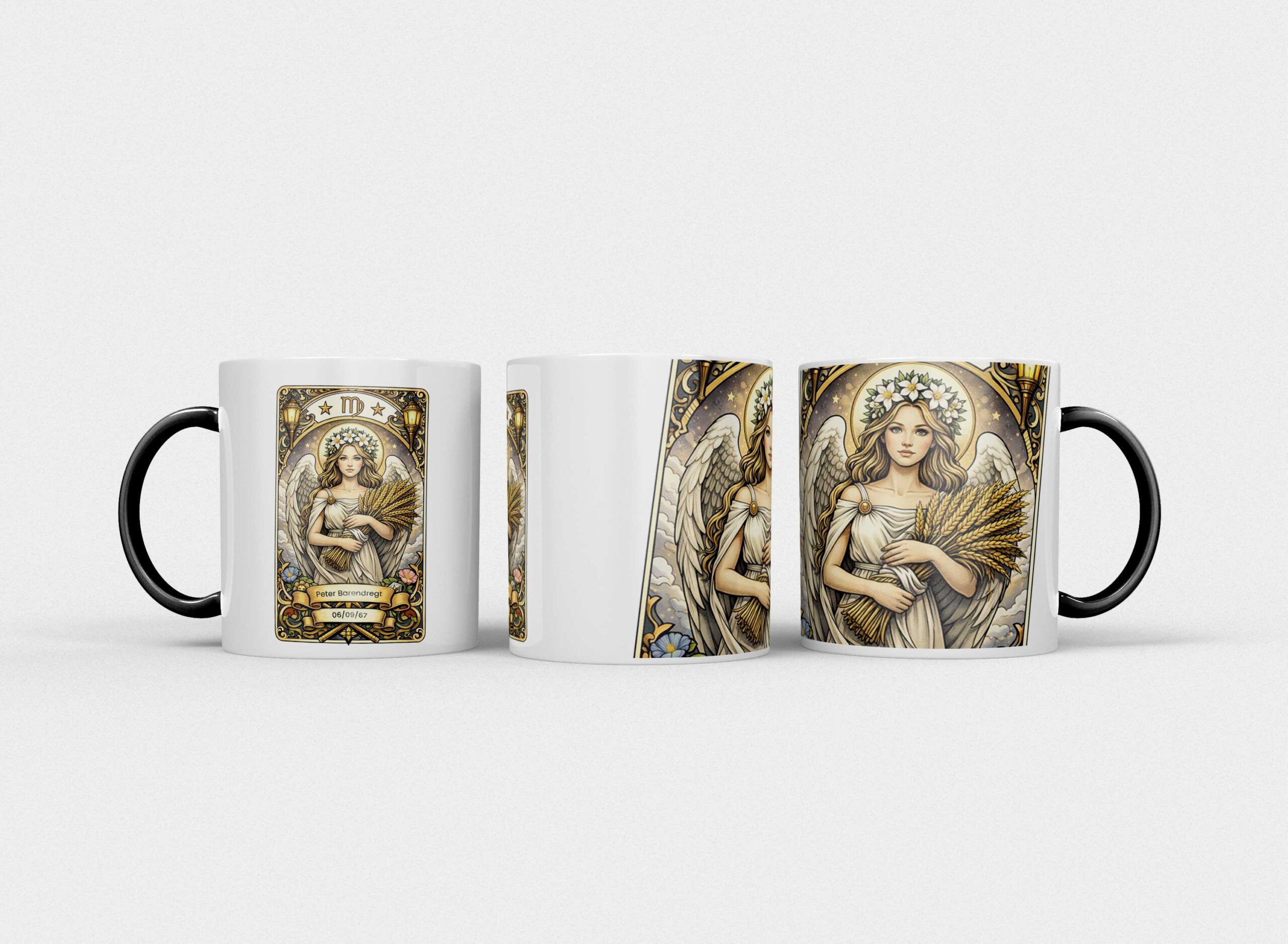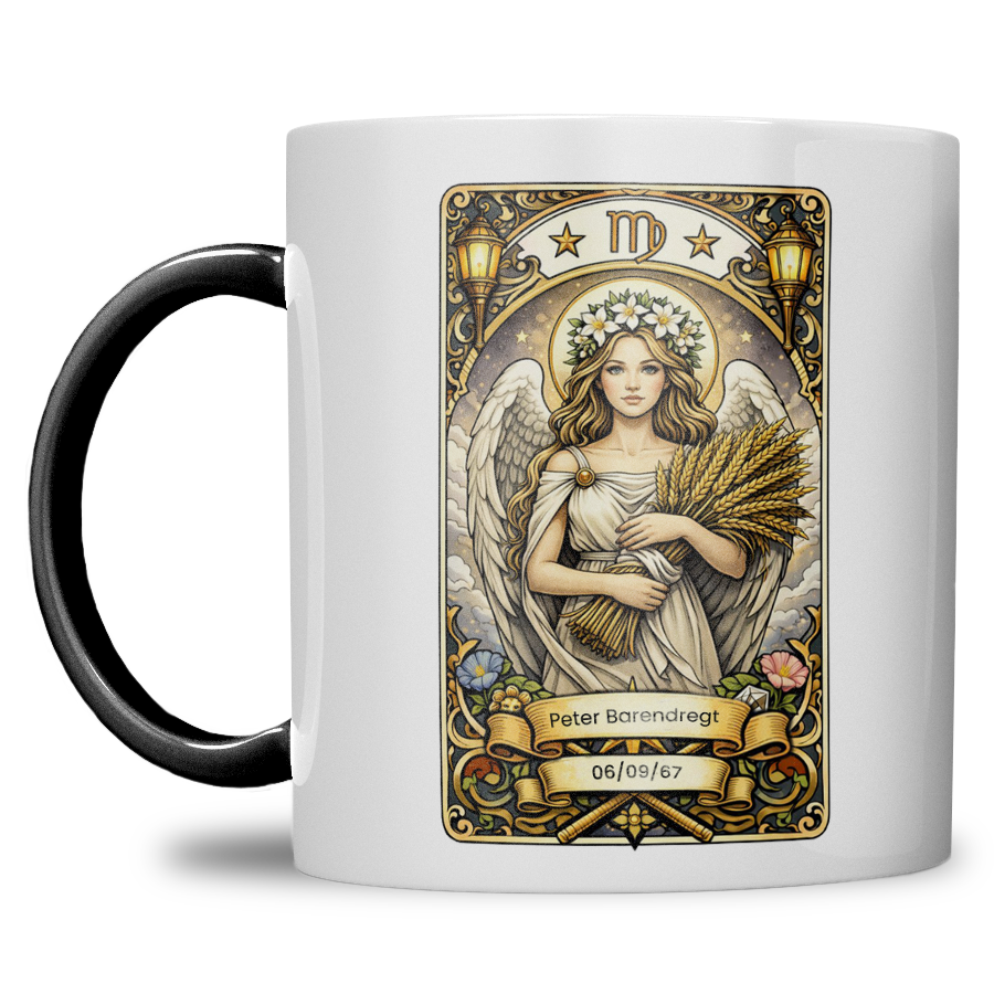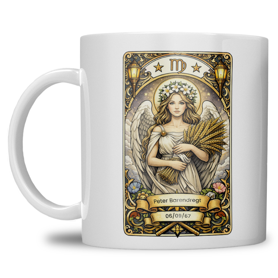 Ben je op zoek naar een stijlvol, persoonlijk en betekenisvol cadeau? Deze gepersonaliseerde sterrenbeeld Maagd mok is speciaal ontworpen voor iedereen geboren onder het verfijnde sterrenbeeld Maagd. De mok wordt bedrukt met een elegante Maagd illustratie in mystieke tarotstijl en gepersonaliseerd met naam en geboortedatum – een prachtig en uniek aandenken.