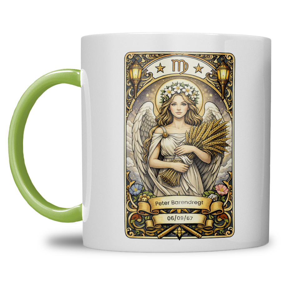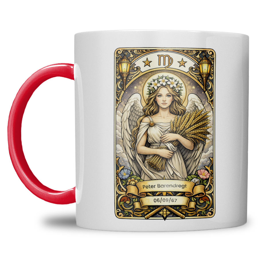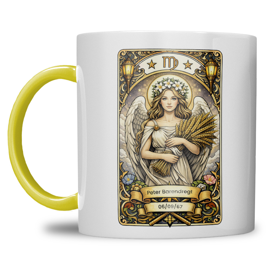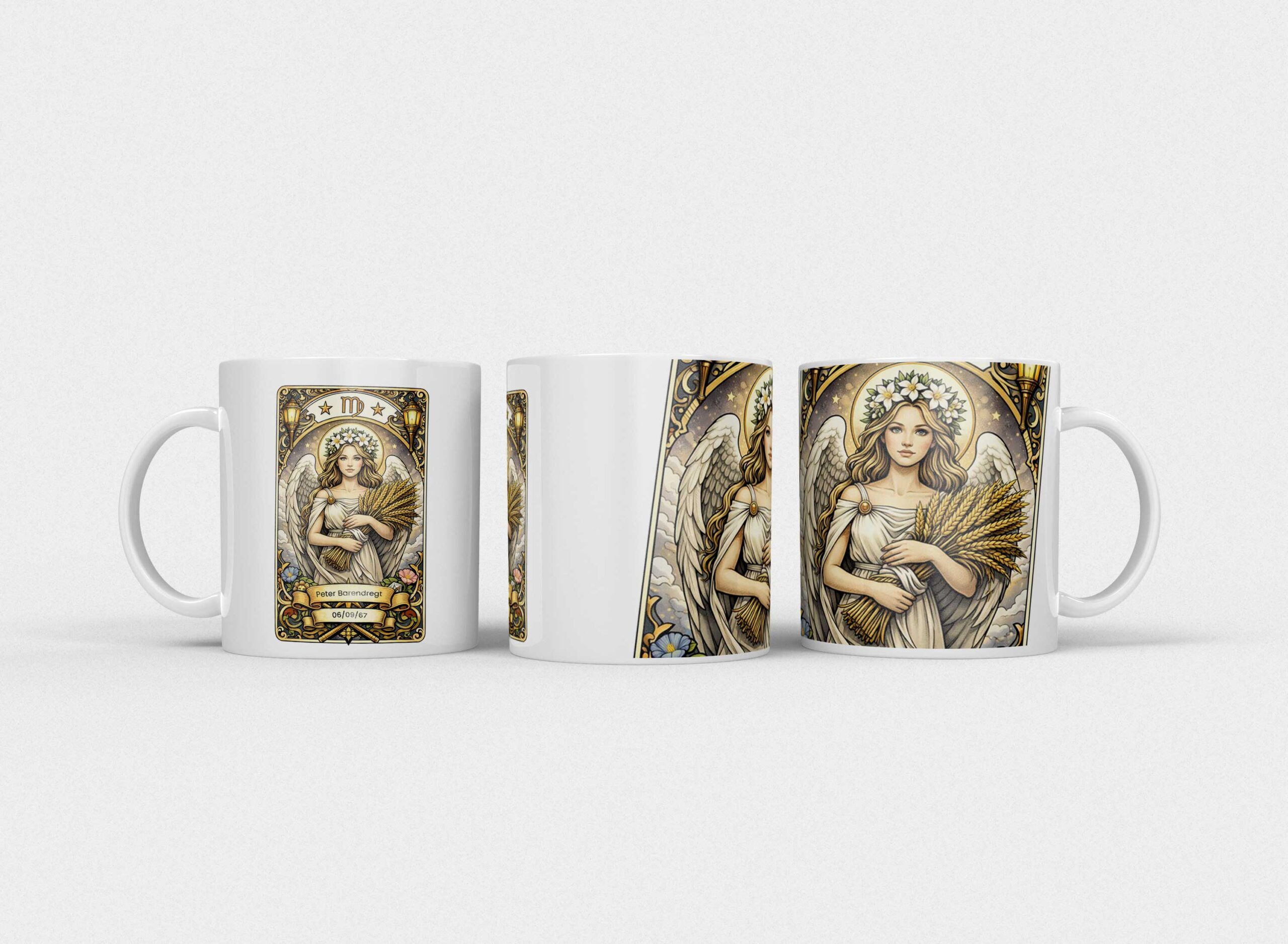 Ben je op zoek naar een stijlvol, persoonlijk en betekenisvol cadeau? Deze gepersonaliseerde sterrenbeeld Maagd mok is speciaal ontworpen voor iedereen geboren onder het verfijnde sterrenbeeld Maagd. De mok wordt bedrukt met een elegante Maagd illustratie in mystieke tarotstijl en gepersonaliseerd met naam en geboortedatum – een prachtig en uniek aandenken.