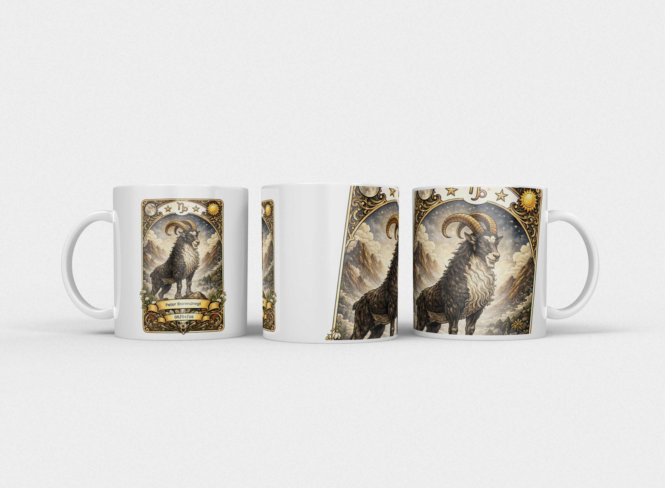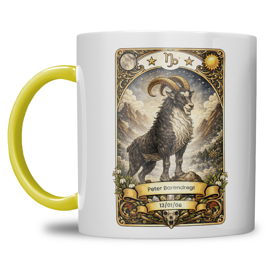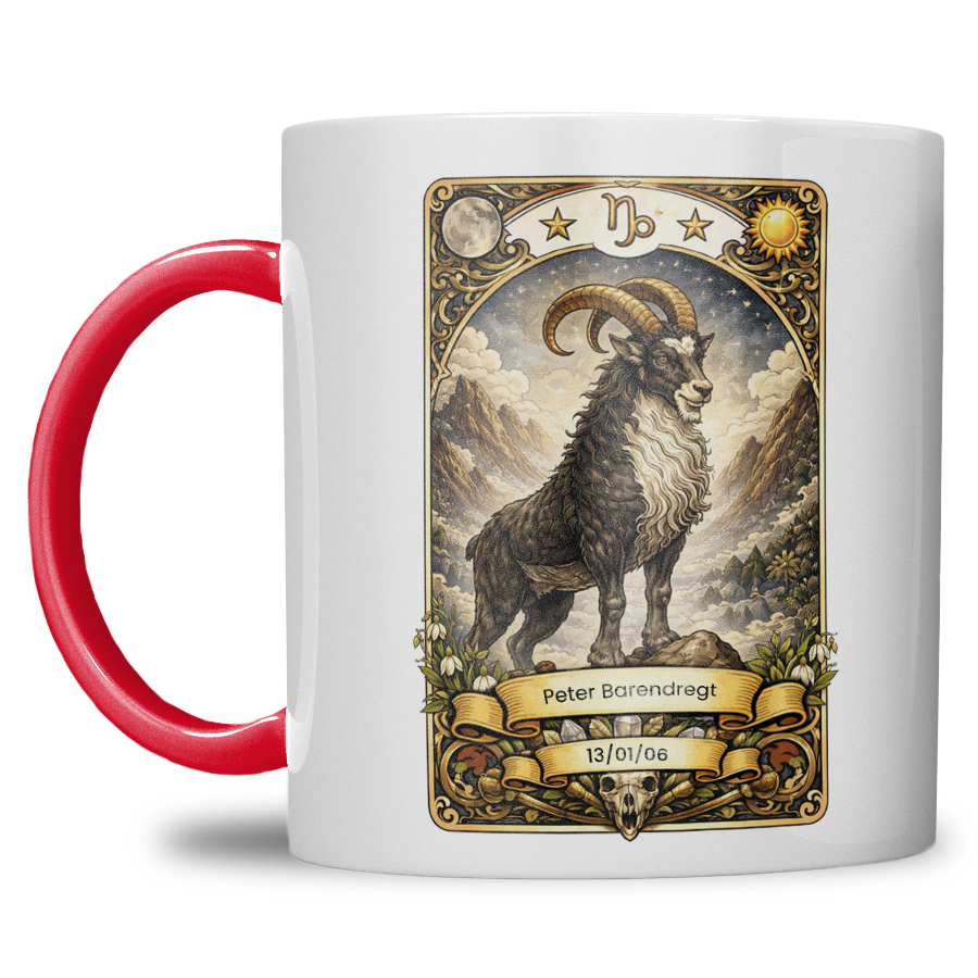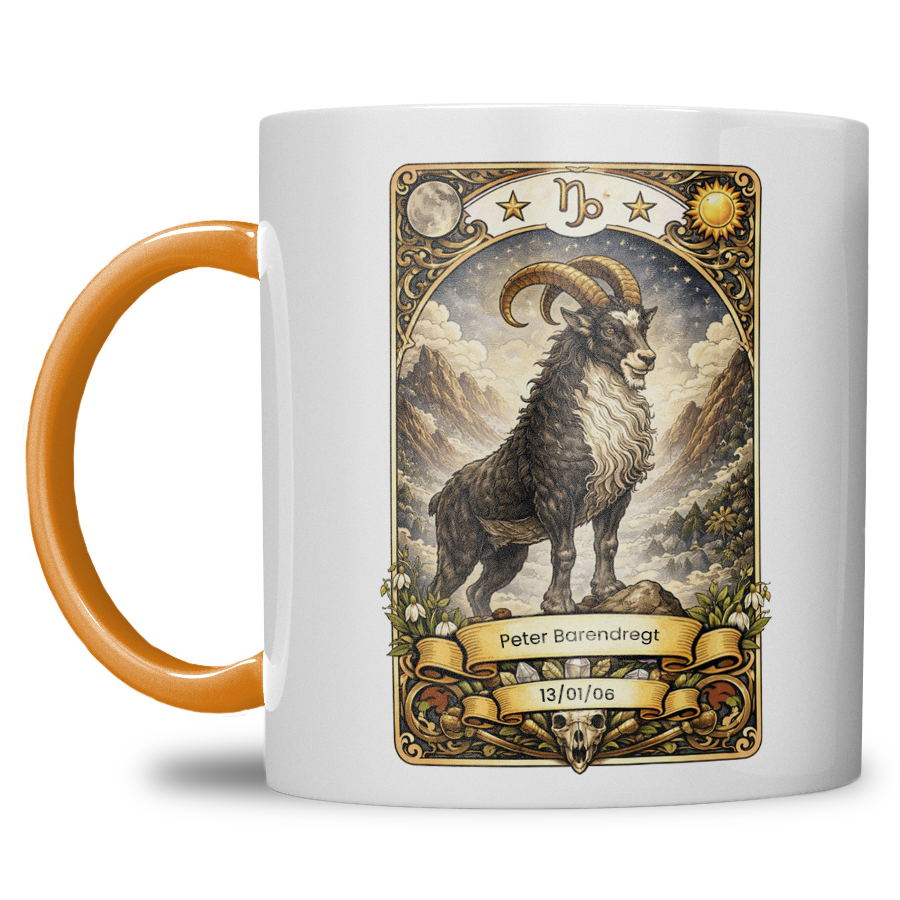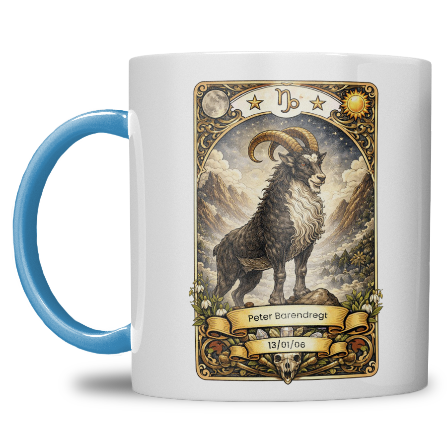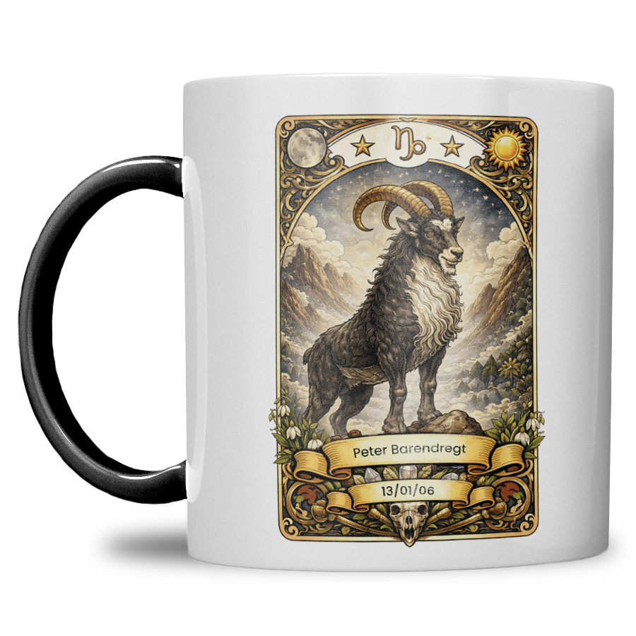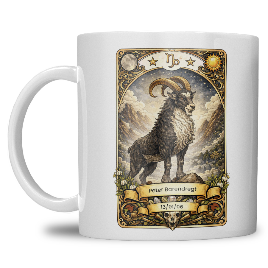 Zoek je een krachtig, stijlvol en persoonlijk cadeau? Deze gepersonaliseerde sterrenbeeld Steenbok mok is speciaal ontworpen voor iedereen geboren onder het ambitieuze sterrenbeeld Steenbok. De mok wordt bedrukt met een indrukwekkende Steenbok illustratie in mystieke tarotstijl en gepersonaliseerd met naam en geboortedatum — een uniek geschenk met blijvende waarde.